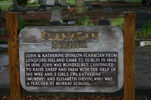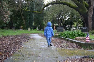 After we collected our supplies and put on our raincoats, we began the search. Our first clue was to find the white archway and then face the church. OK, pretty easy. We knew we were on the right path. Then we were instructed to “turn left and look for the biggest stone cross.” Being a cemetery, there were quite a few crosses, but my son quickly found the largest one, which was pretty obvious. He was so excited! Upon reaching the cross, the instructions suggested we “take a moment to read about the first Dublin settlers.” Cool, a history lesson, too! We learned about the Flanagan family.