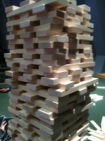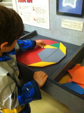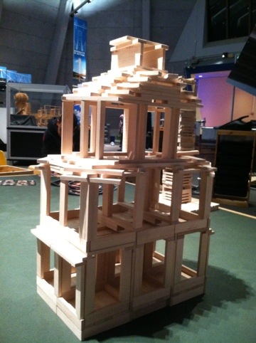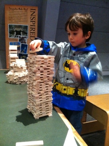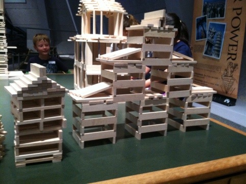 My son enjoys building with just about anything.  Here he’s building with the Kapla blocks in the “Design, Build, and Test” exhibit.  We own a similar (pretty much identical) toy at home… CitiBlocs.  I love these because of their simplicity.  It’s just one  shaped block, but hundreds of them.