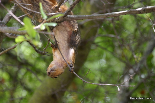 We’ve had this one bird feeder in the backyard for almost two years now, without any problems with squirrels.  But that changed this week.  We now have a small red squirrel who visits us daily, cleans up the seeds dropped on the ground by the birds, and has, unfortunately, begun to raid the bird feeder itself.  He’s actually figured out how to raid both of our feeders.  I think I’ve outwitted him for now, though, by putting the the feeders out on weaker branches in the oak tree and by putting the feeders farther away from the branches by adding additional clothes hangers.  Seems to be working so far!