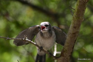 The baby scrub jay is leaving the nest more frequently, testing his wings… so cute. Every time the baby “screeches” for food, he puffs up and flaps his wings.