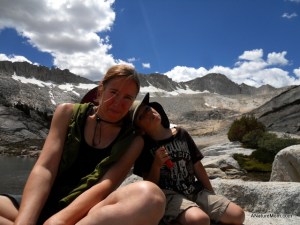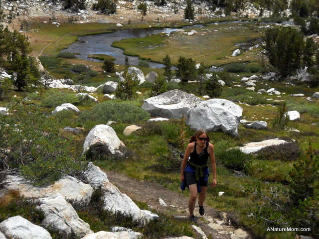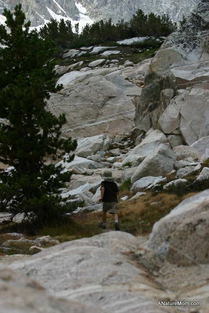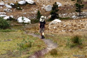 My husband and I love hiking above the 10,000 foot level (the trail starts at Saddlebag Lake, 10,080 ft and only goes up from there), and this was a great way to introduce our son to this kind of hiking.  This hike is located just outside Yosemite National Park.  The trails are not marked, so this wouldn’t be a good hike for anyone who has an issue with ambiguity.  Trails split without any instructions as to which way to go.  To us, this is part of the fun!  We meandered along, basically knowing which direction we wanted to go (my husband has hiked several of the peaks that can be reached from this trail).  We chose the routes that led around to the right of the many lakes and ponds.