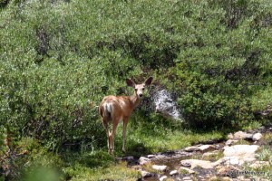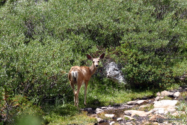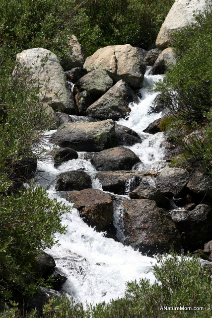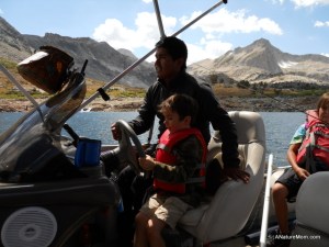 We wandered up about two miles until we found a nice spot next to one of the Conness Lakes to rest and have lunch.  Along the way, we enjoyed gorgeous views of mountain peaks, meadows, a meandering stream, multiple lakes, deer, wildflowers, tons of tiny little frogs, waterfalls, storm clouds, and a snake.  On the return boat ride, they let my five-year-old drive (don’t worry, the driver was also holding on)!