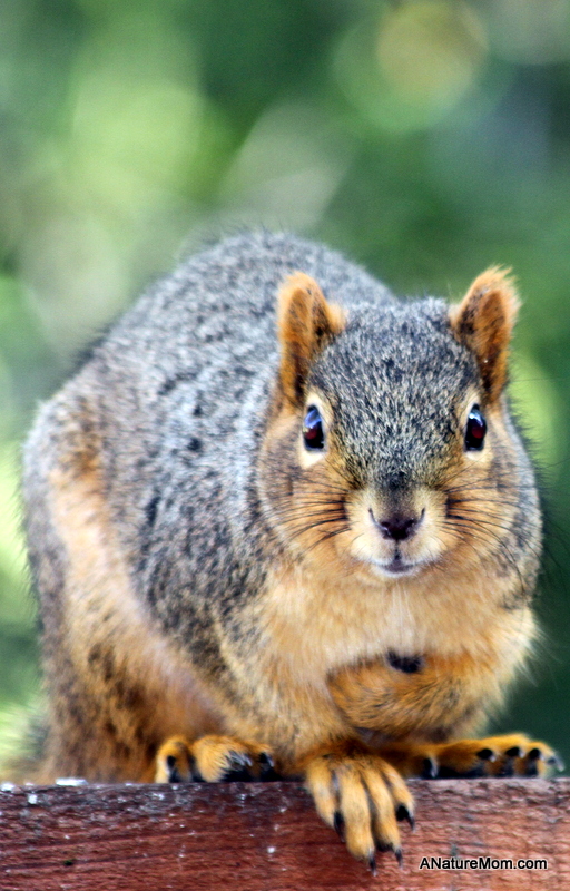 Yes, he is definitely a nuisance, but we do enjoy watching his antics. My son made a pinecone birdfeeder at school on Friday. I hung it up… the birds weren’t so interested, but the squirrel loved it! This squirrel visits every day, but he was here much longer yesterday due to that feeder. 🙂