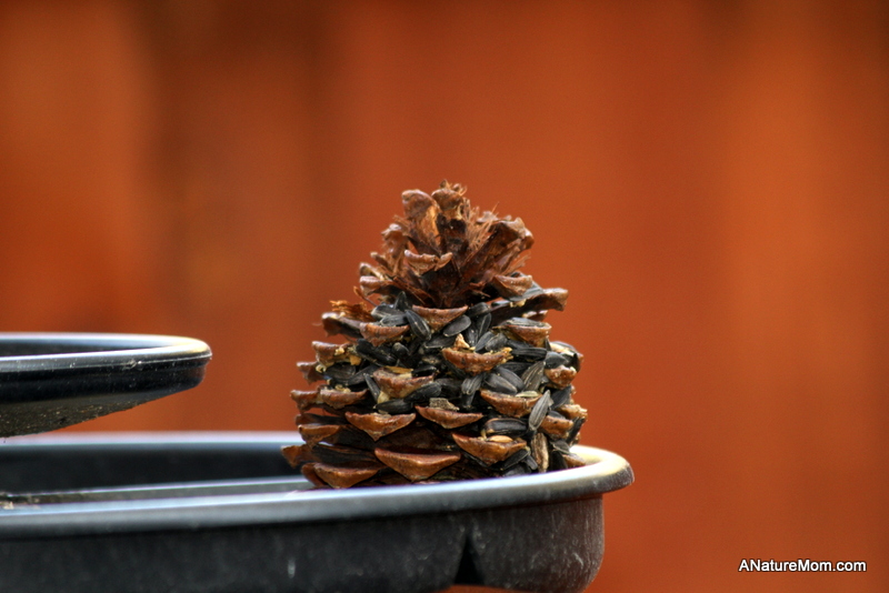 Easy-to-do:  Smash peanut butter into pine cone, roll cone in bird seed, hang…
