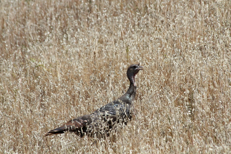 The bird is a turkey. The tall grasses make her look small. 🙂