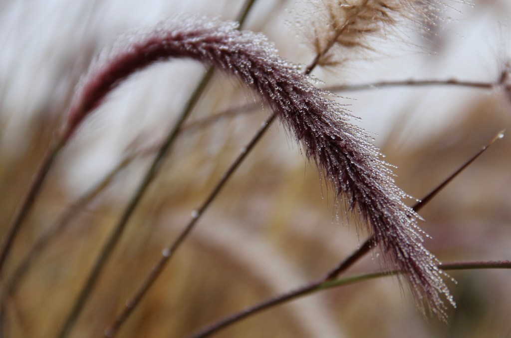 Things have been extremely dry here in California this year, so I was excited on Monday to wake up to a wet city and the wonderful scent of fresh rain. Here’s my photo, an attempt to capture the droplets of water on one of the plants in my front yard.